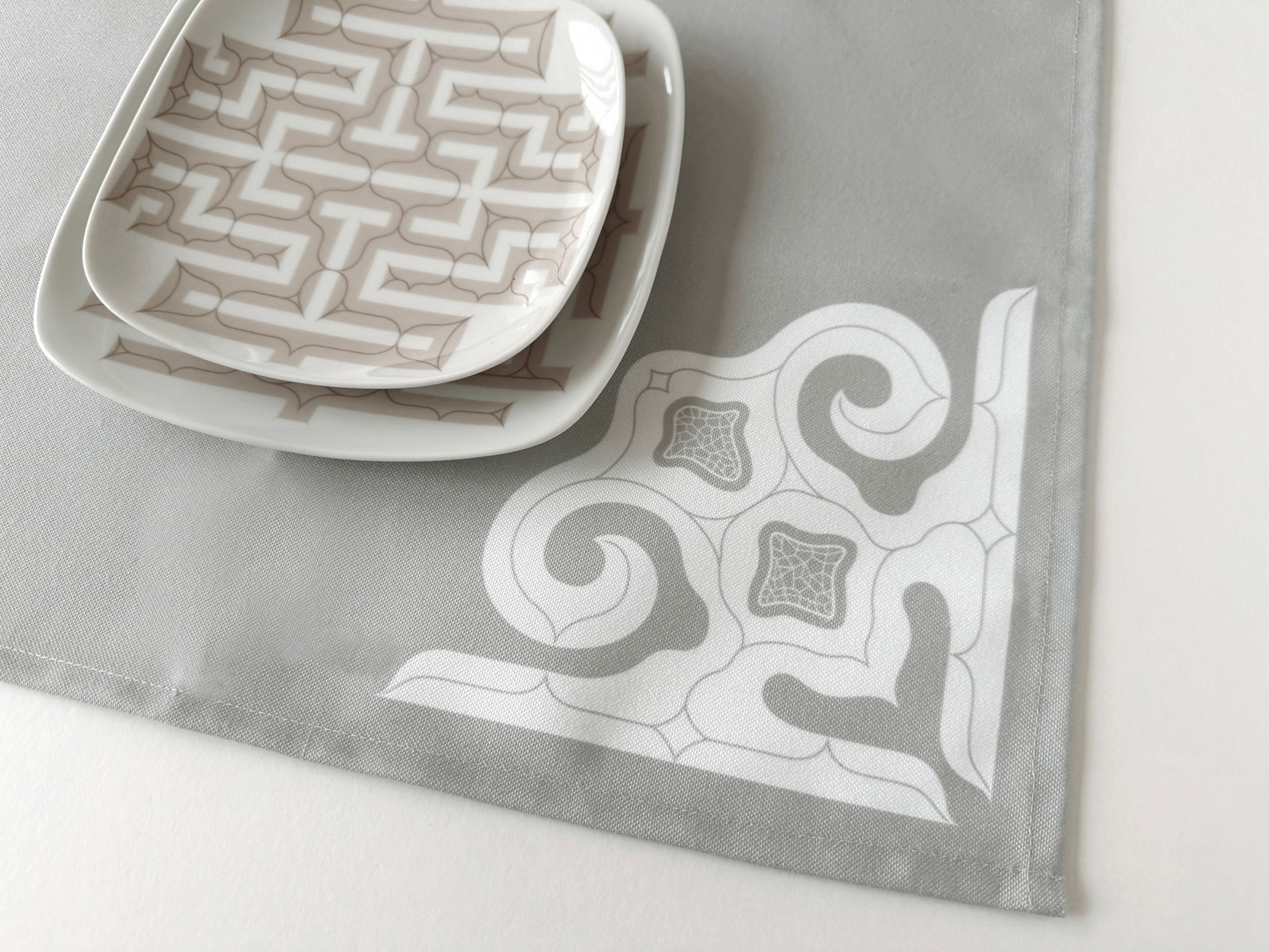 アイヌ刺繍の多様な美しさを知っていただきたく、イカㇻカㇻ(刺繍)をテーマにデザインしました。プレートにはチカㇻカㇻぺ(※1)を、プレイスマットはカパラミㇷ゚(※2)を表現しました。木彫りと刺繍のアイヌ文様の違いをお楽しみください。(岡本 朋也)