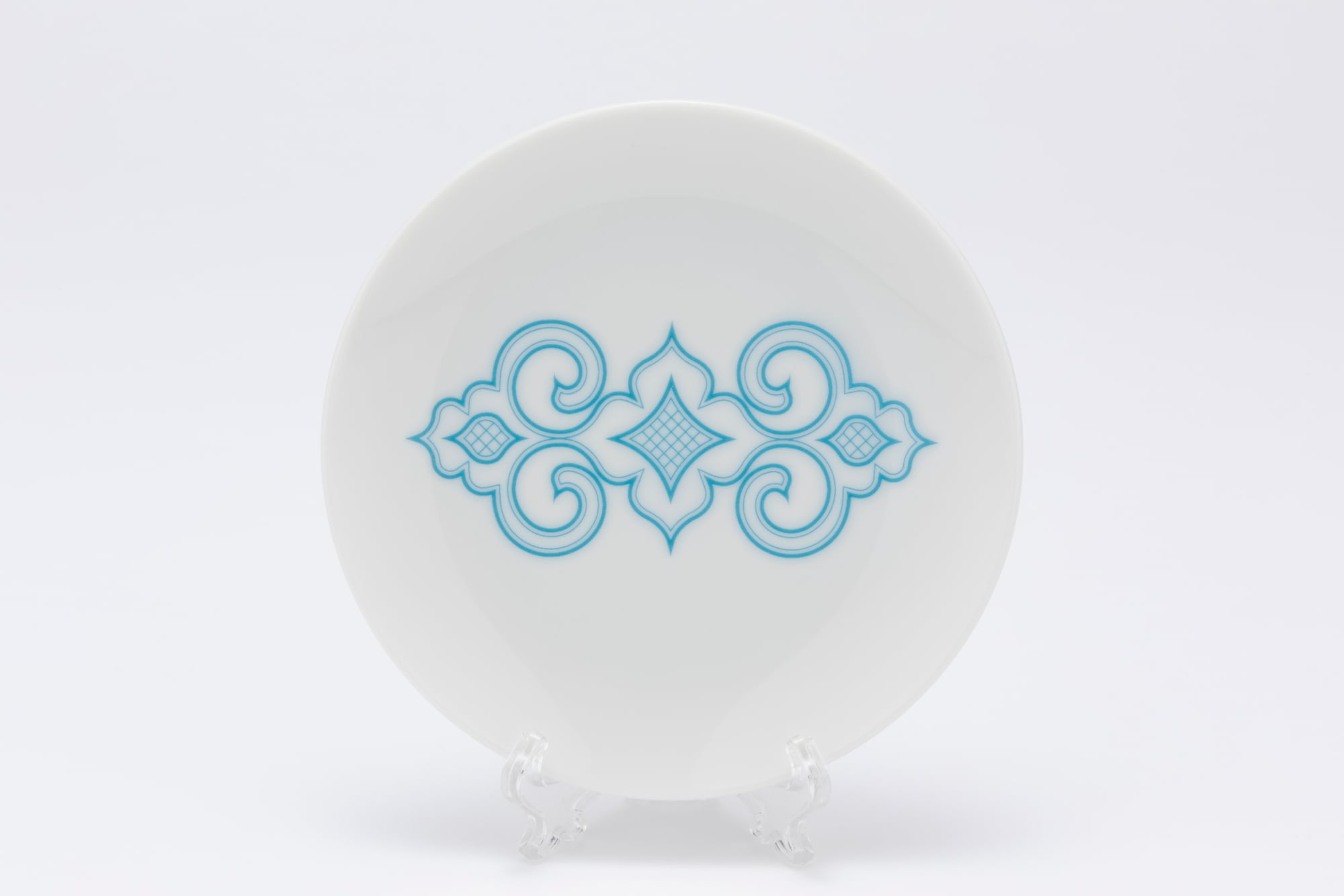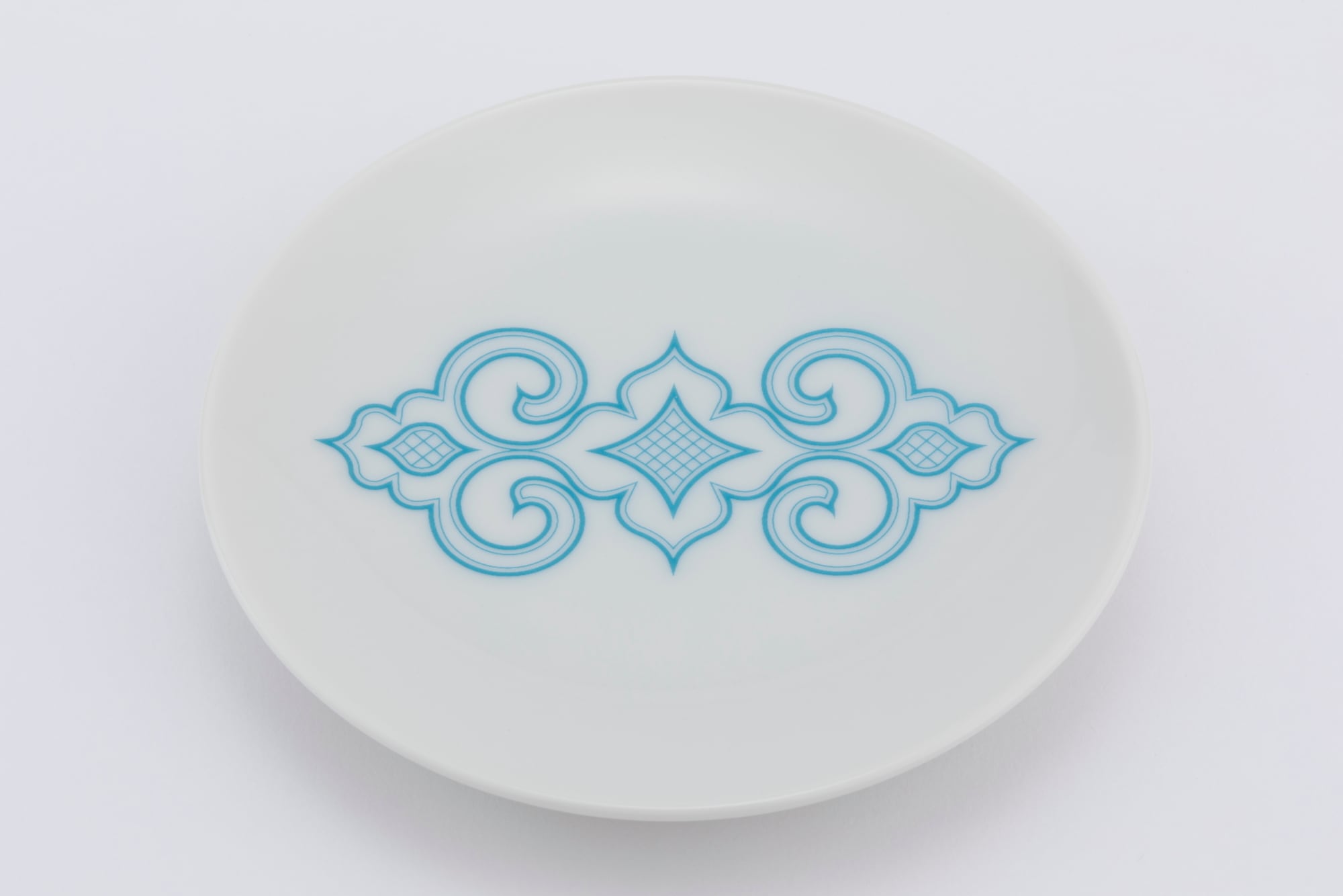 力強い印象の多いアイヌ文様ですが、プレートには優しい印象を意識してデザインしました。ノンノ(花)や植物のつるでやわらかさを表現しながら、色はすこし濃い青を用いて、やわらかな文様に大人らしさを加えました。陶器の白とのコントラストもお楽しみください。(平村 太幹)
